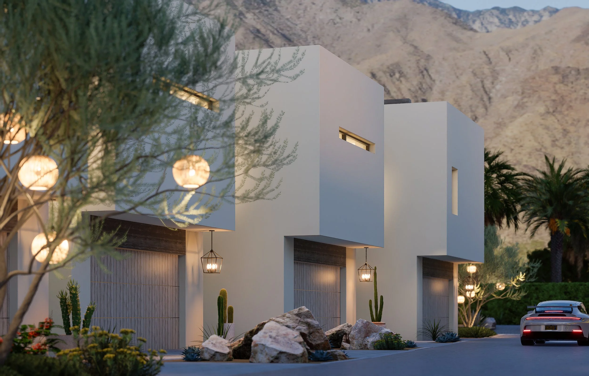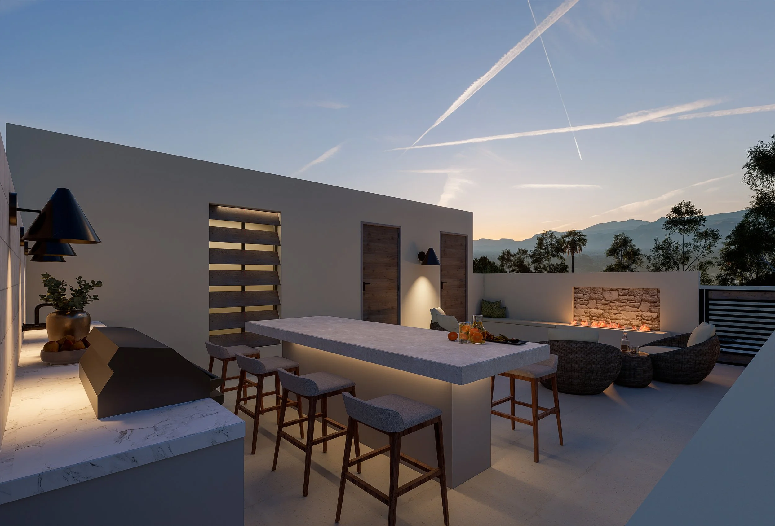 Each residence at The Twelve boasts three spectacular levels of outdoor living, crowned by fully outfitted roof decks with outdoor kitchens, fireplace lounges, and private elevators. Expansive glass sliders open to private patios and dipping pools, seamlessly blending indoor and outdoor spaces. The views are breathtaking—endless palms and the rugged silhouette of Mt. San Jacinto rise above Old Las Palmas’ historic estates, creating a serene desert oasis just minutes from downtown Palm Springs.